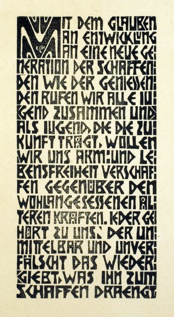 Bleyl trat jedoch bald wieder aus. Titel programm der künstlergruppe brücke, text künstler.